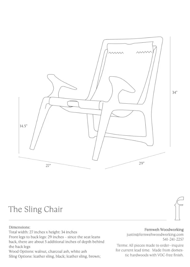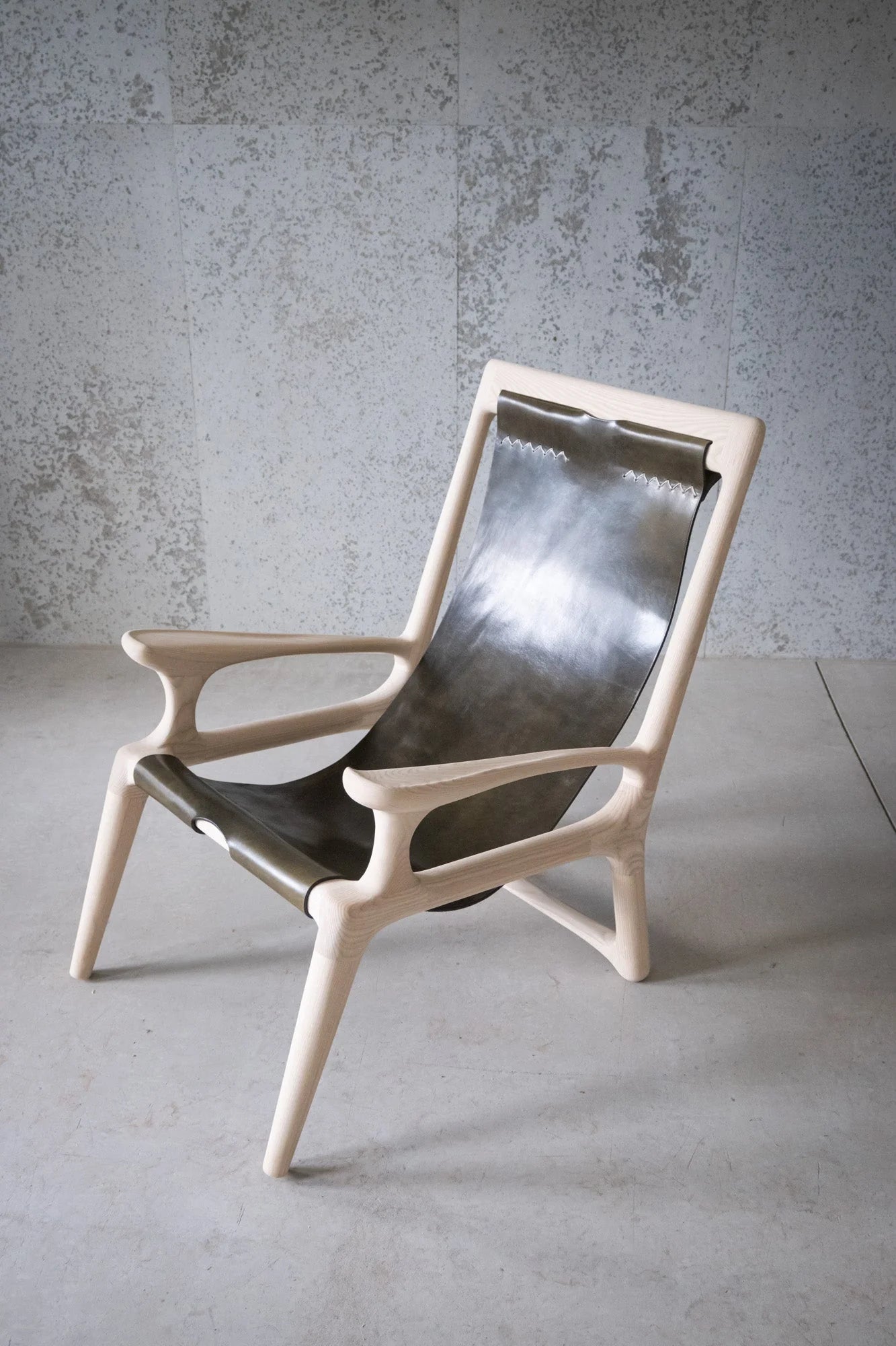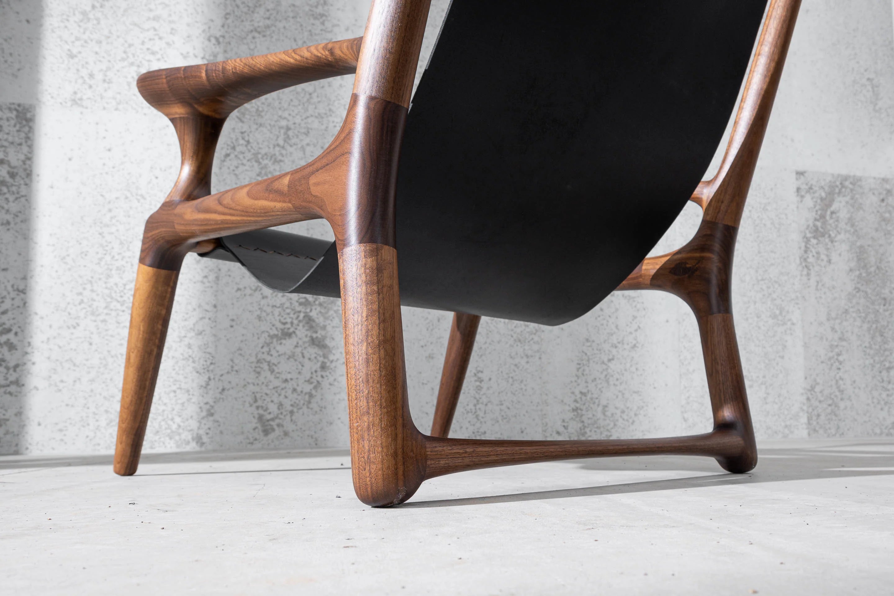 Introducing the Fernweh Walnut Leather Sling Chair - the perfect blend of style and comfort. Hand-crafted with high quality Walnut, White Ash, or Charcoal Ash, this award-winning piece is designed with sleek joinery inspired by Danish and Scandinavian design. The slung leather seat, available in black, saddle brown, and olive green, adds a touch of luxury and sophistication to any room. Don't miss the chance to make a statement with the inaugural piece from Fernweh Woodworking in Bend, Oregon.