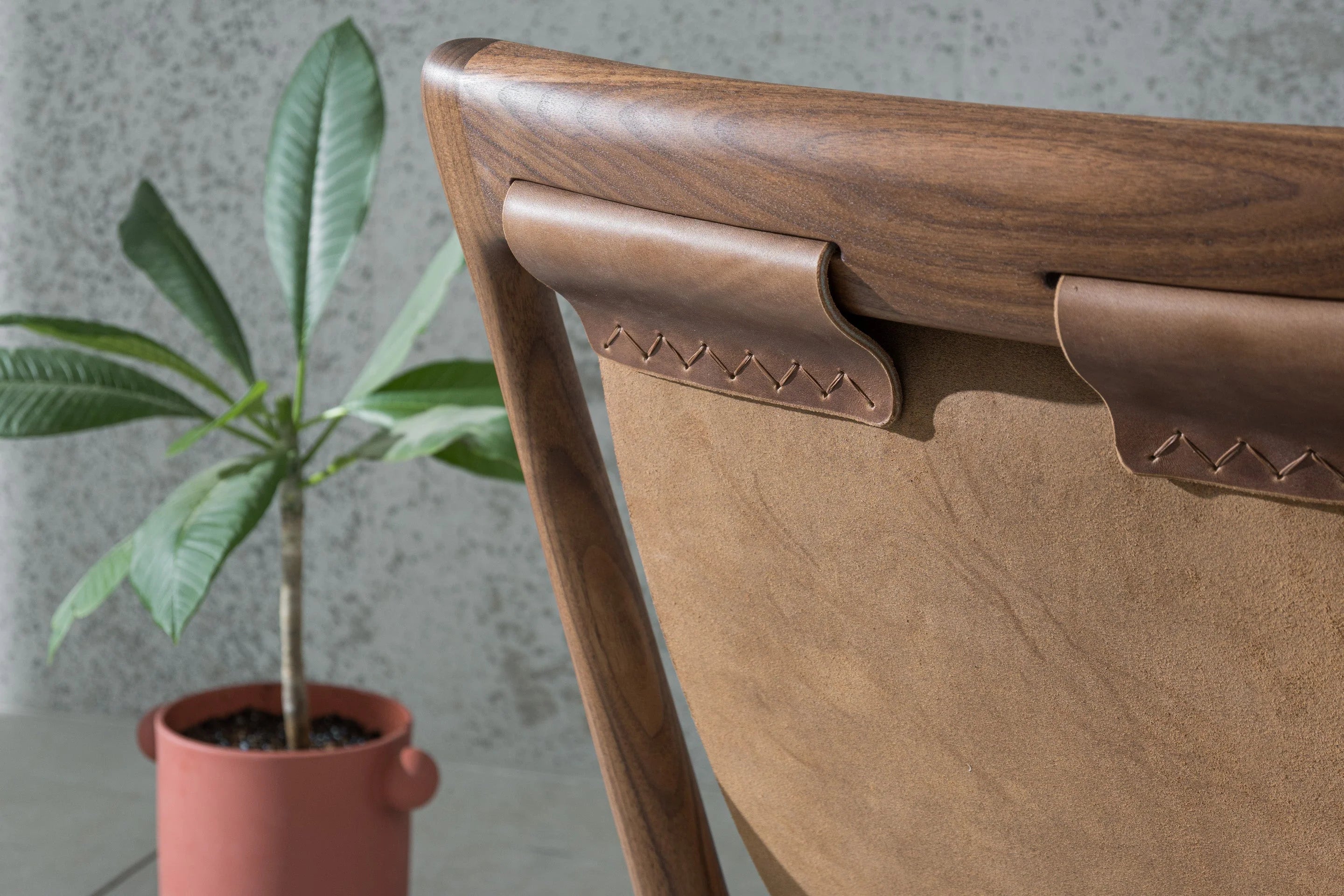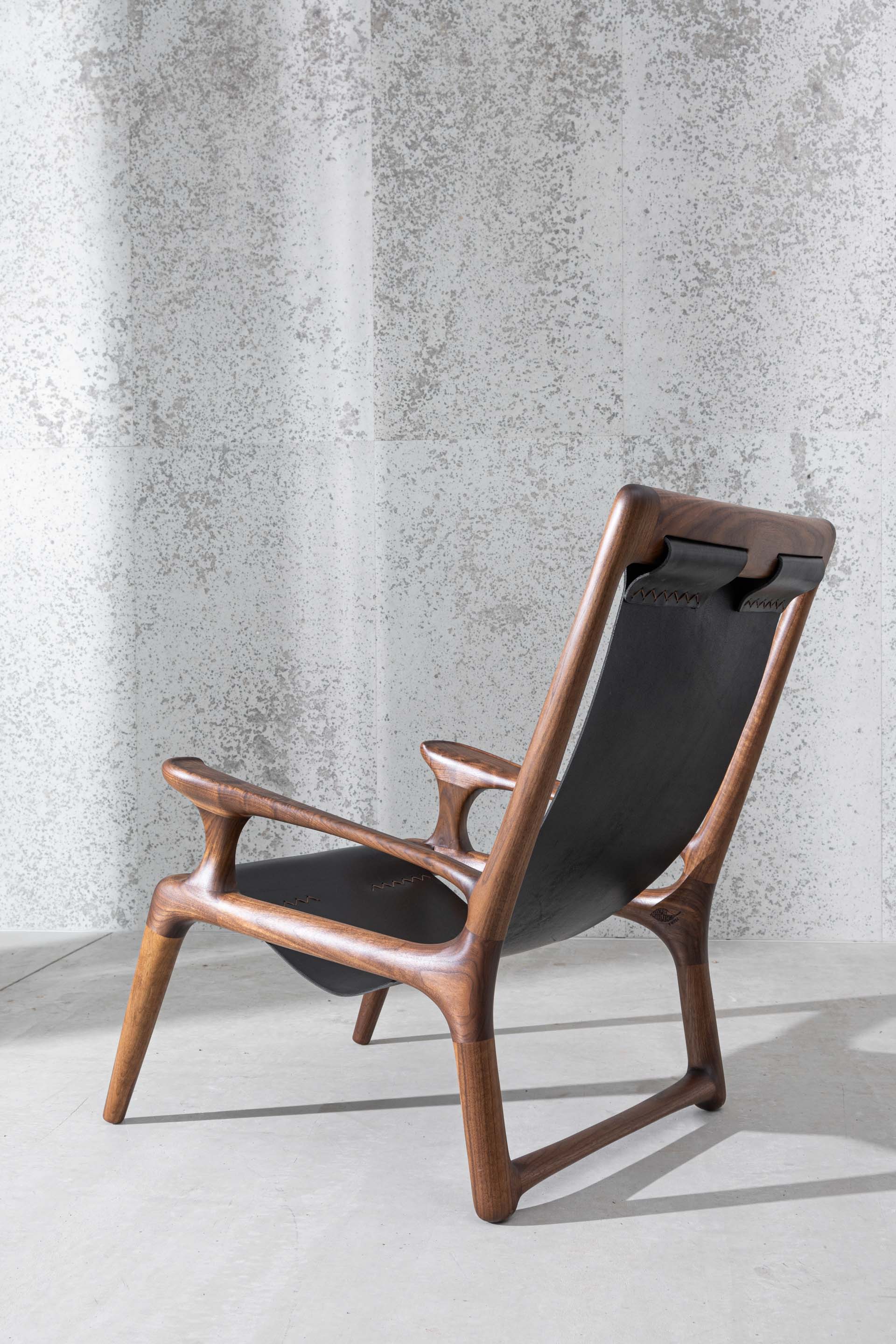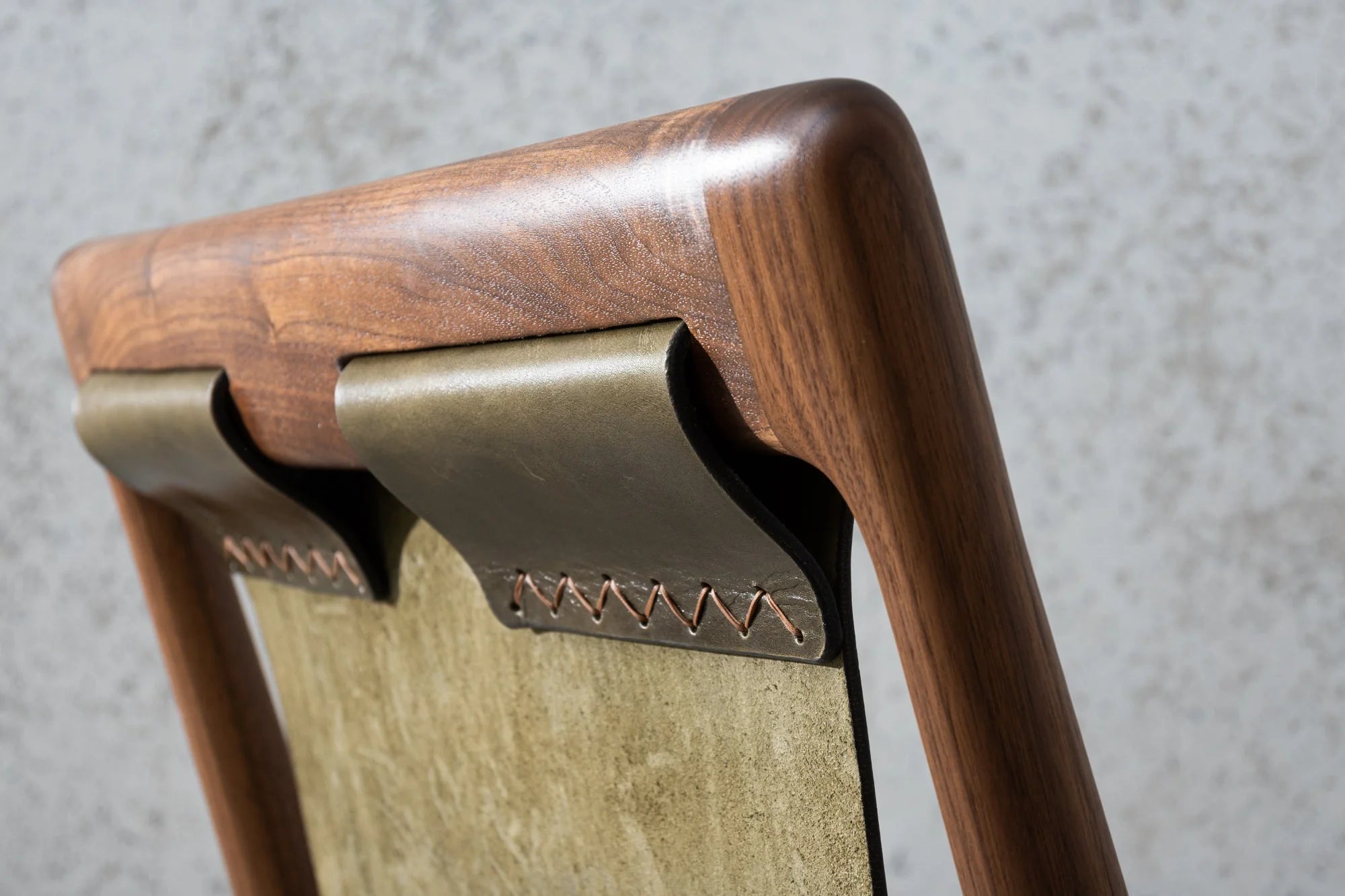 Introducing the Fernweh Walnut Leather Sling Chair - the perfect blend of style and comfort. Hand-crafted with high quality Walnut, White Ash, or Charcoal Ash, this award-winning piece is designed with sleek joinery inspired by Danish and Scandinavian design. The slung leather seat, available in black, saddle brown, and olive green, adds a touch of luxury and sophistication to any room. Don't miss the chance to make a statement with the inaugural piece from Fernweh Woodworking in Bend, Oregon.
