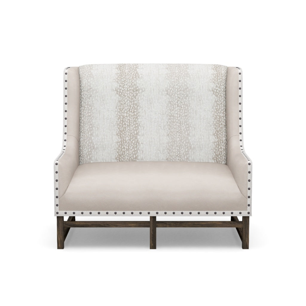 Experience understated luxury with the Heidi Leather Settee. Crafted from top-grain leather, it showcases a delicate axis print on the seat back for a refined touch. Made in America, this elegant piece offers customization options to perfectly complement your style and interior. The price includes premium leather, upholstery-grade fabric, nailhead trim, and a slate grey finished frame.