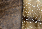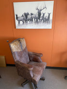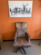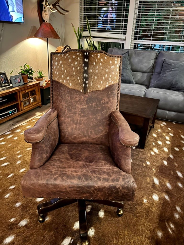 Enjoy unparalleled comfort and elegance with the Hair on Axis Hide & Leather Office Chair. Featuring genuine axis deer hide and premium top grain leather upholstery, this handcrafted Texas-made chair offers durability and style. Its rich earth tones and natural textures bring authentic charm to your home or rustic executive office, making it a distinguished focal point in any workspace.