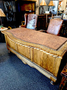 Transform your workspace with this artisan-crafted executive desk, where Western heritage meets refined elegance. The sumptuous leather desktop, adorned with hand-applied nail trim and meticulously carved details, creates an atmosphere of understated luxury. Perfect for the discerning professional, this handmade piece infuses your office, study, or creative sanctuary with authentic character while projecting confidence and cultivated style. A functional work surface that doubles as a striking focal point.
