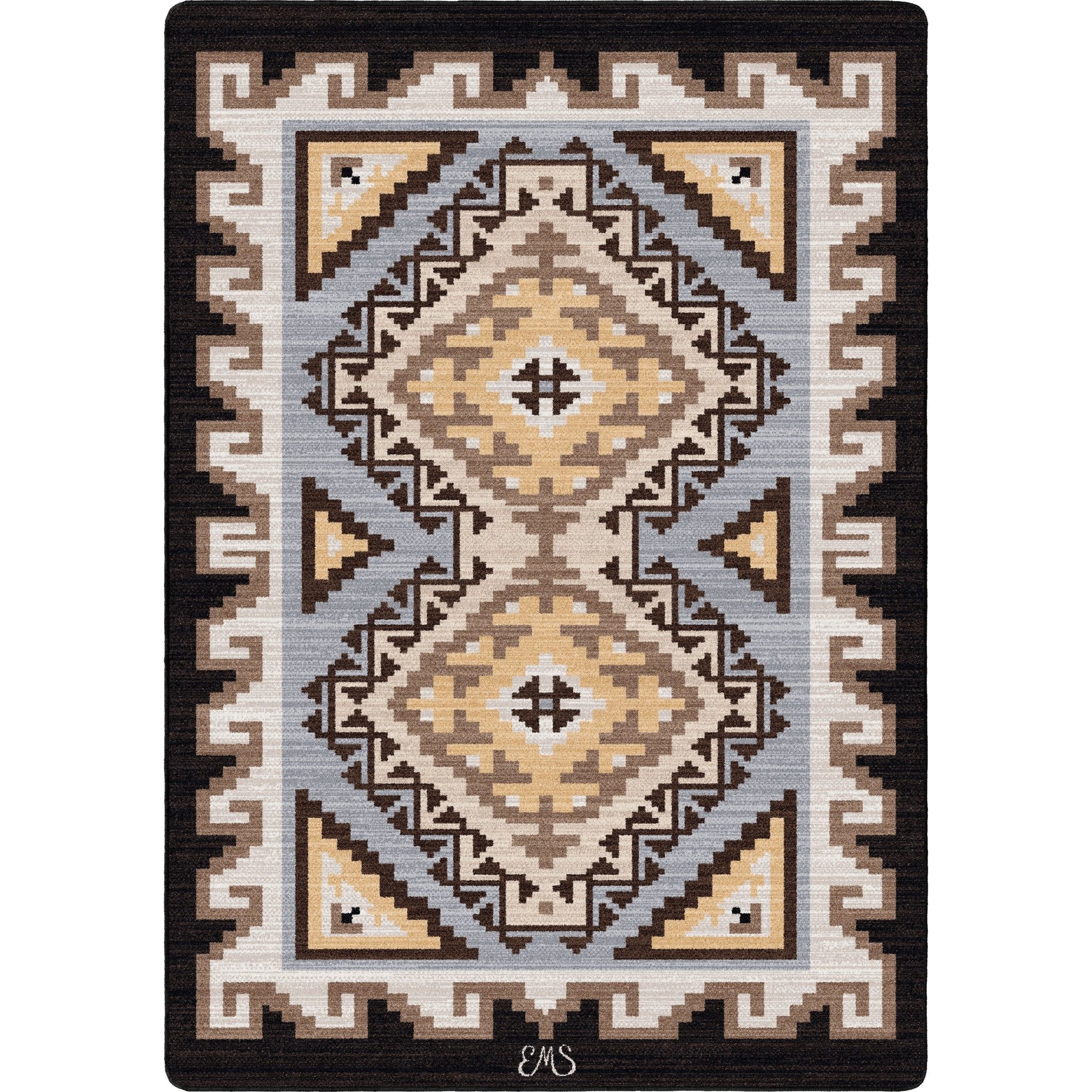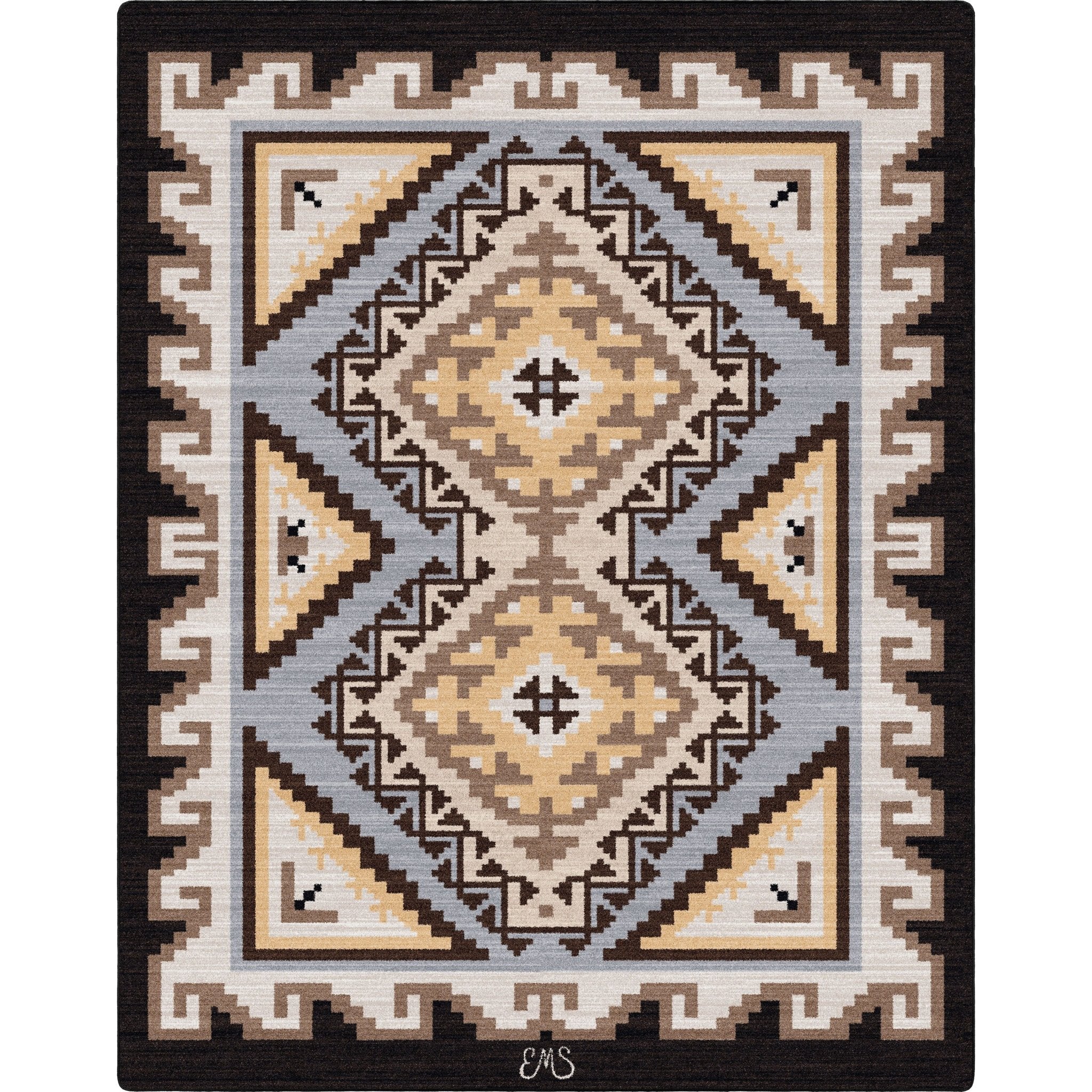 Add a touch of Native American culture to your home with the Mothers Teachings Rug Collection. Featuring hues of blue, yellow, tan, and black, this commercial-grade rug is made in the USA by artist Eugenia Stanley. Bring beauty and tradition into your space!