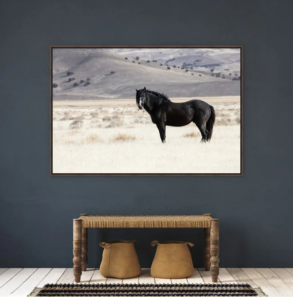 Expertly crafted and framed in matte black, Royal Black - Framed Horse Art is a must-have for any interior design. With its horizontal orientation, this piece adds a touch of sophistication and emotional resonance to any space, making it the perfect focal point for a living room, bedroom, or office. Whether in a desert ranch or modern home, this horse art is sure to captivate with its understated charm.