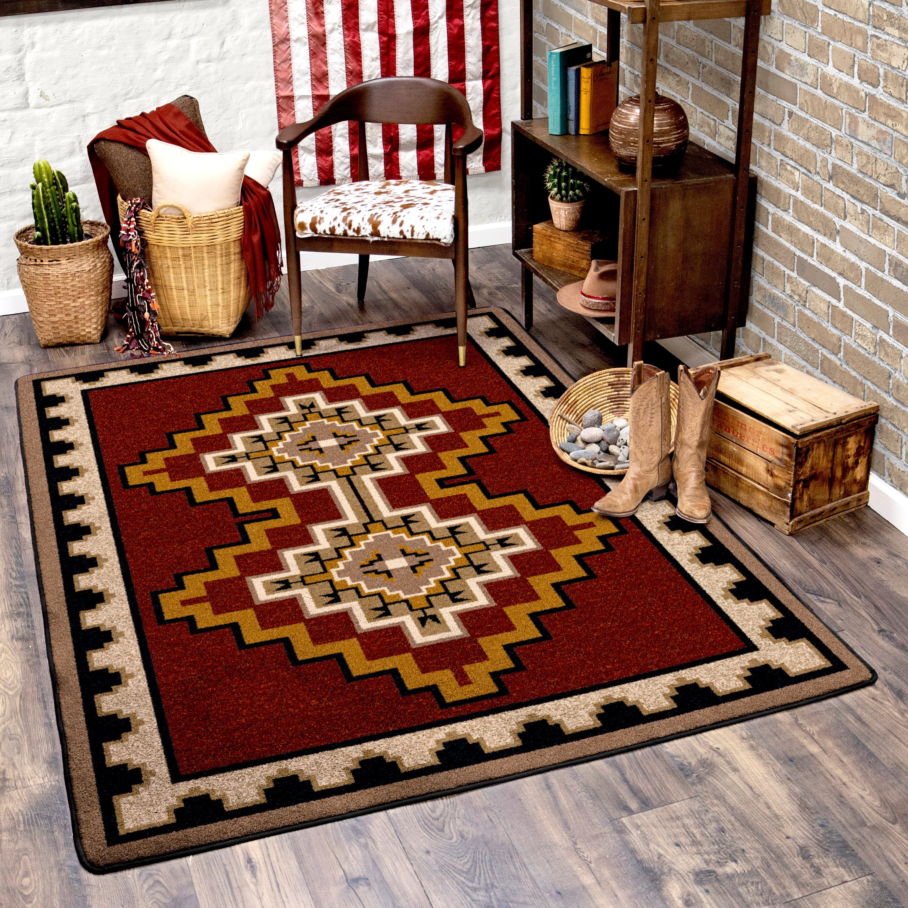 Experience the luxurious beauty of Council Fire in Red Area Rugs, featuring a stunning deep red center and a striking yellow design. This must-see pattern will add a touch of Southwestern elegance to any home decor. Elevate your space with our expertly crafted American rug collection, available in 6 sizes including a floor runner and round area rug, to suit all of your heavy-duty floor covering needs.