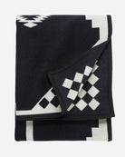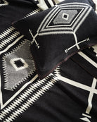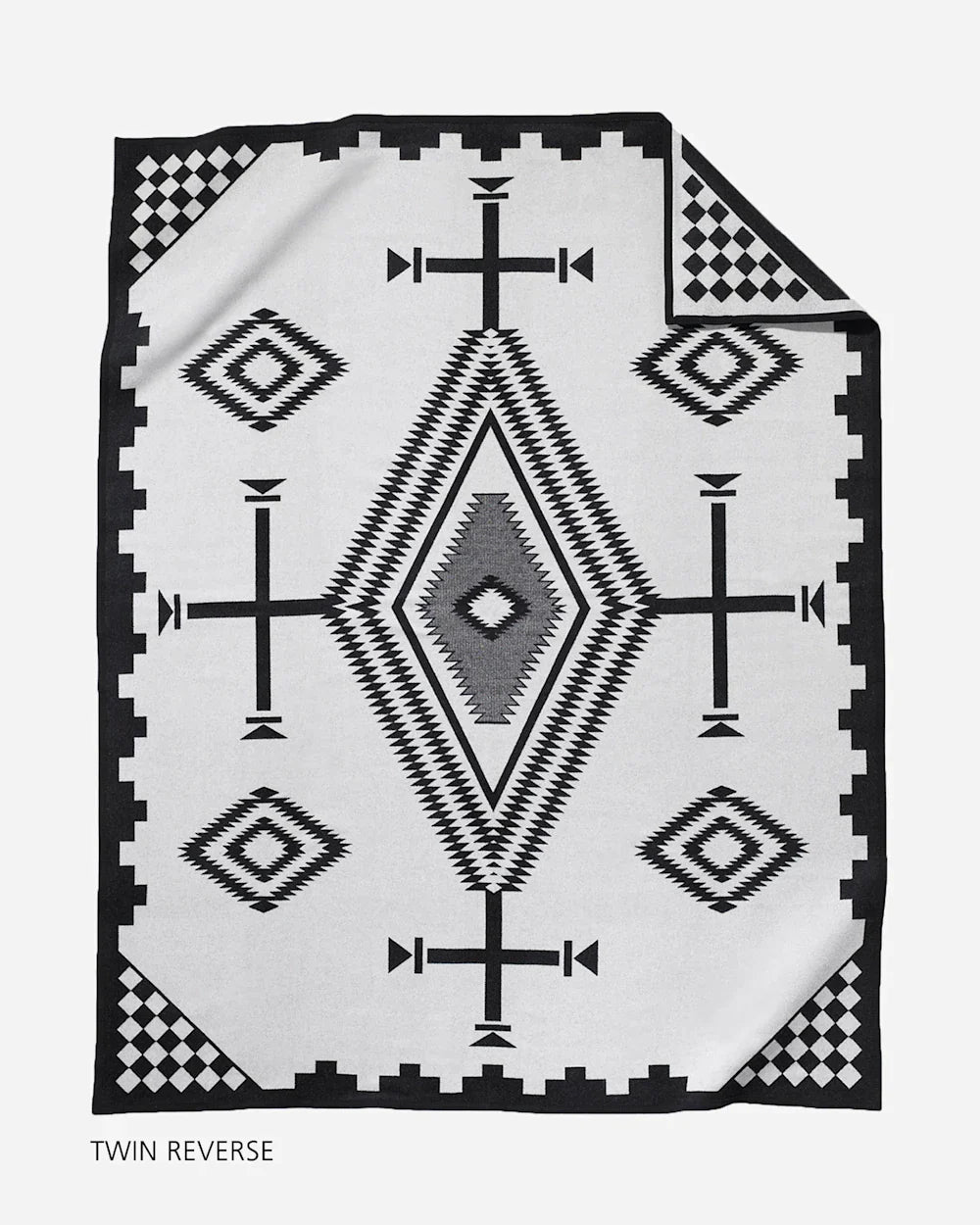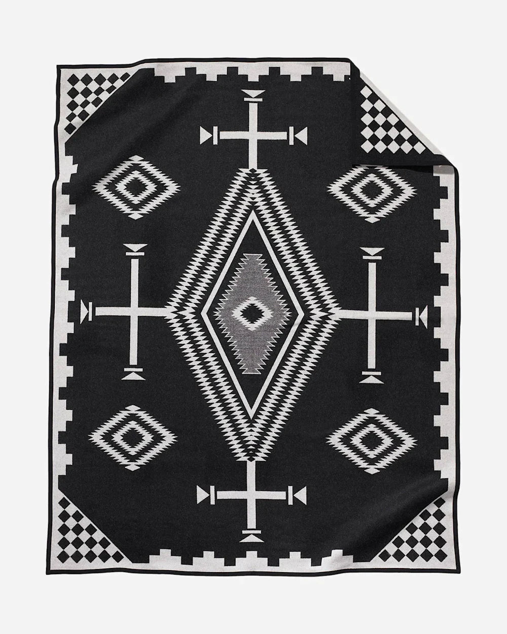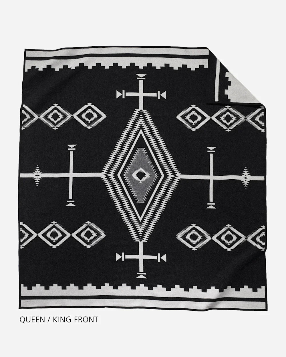 Enjoy the beauty of Spanish crosses, diamond-shaped "eyes" (ojos), and Navajo Four Mountains of Creation symbols with our Los Ojos Blanket. Pendleton's state-of-the-art mills create a mesmerizing reversible design, smoothly transitioning from a black background to white with precision and sophistication. Discover the allure of this unique and expertly crafted blanket today!