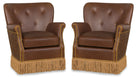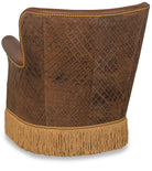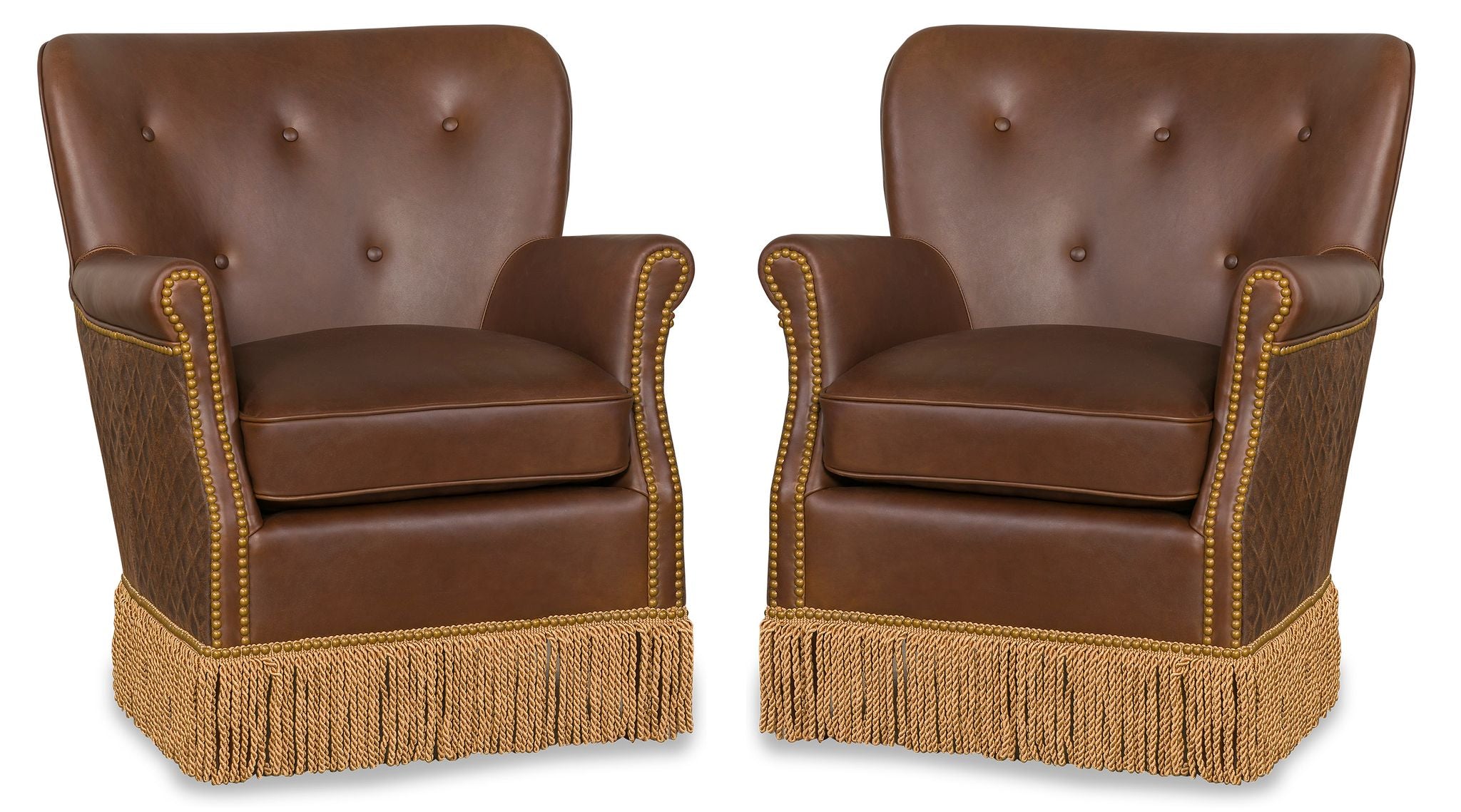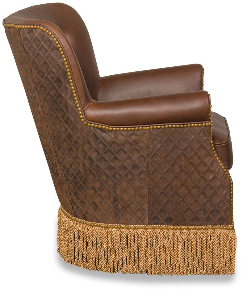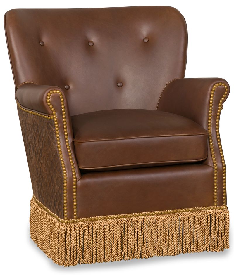 Experience the sophisticated elegance of the McCoy Bullion Leather Swivel Chair. This distinctive leather chair combines a button-tufted back, gracefully curved armrests, a removable seat cushion, nailhead trim, and a decorative bullion twisted fringe for a truly standout piece.