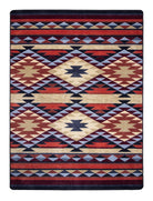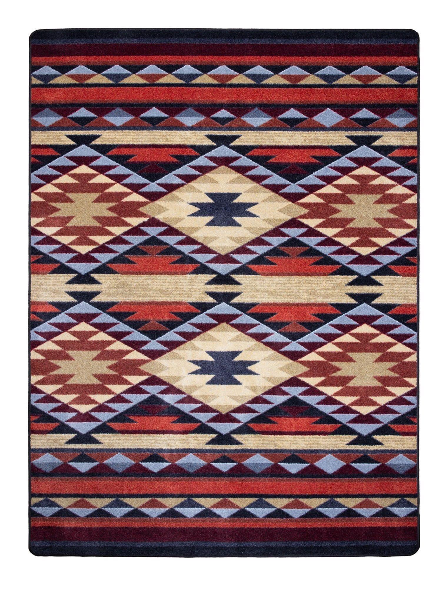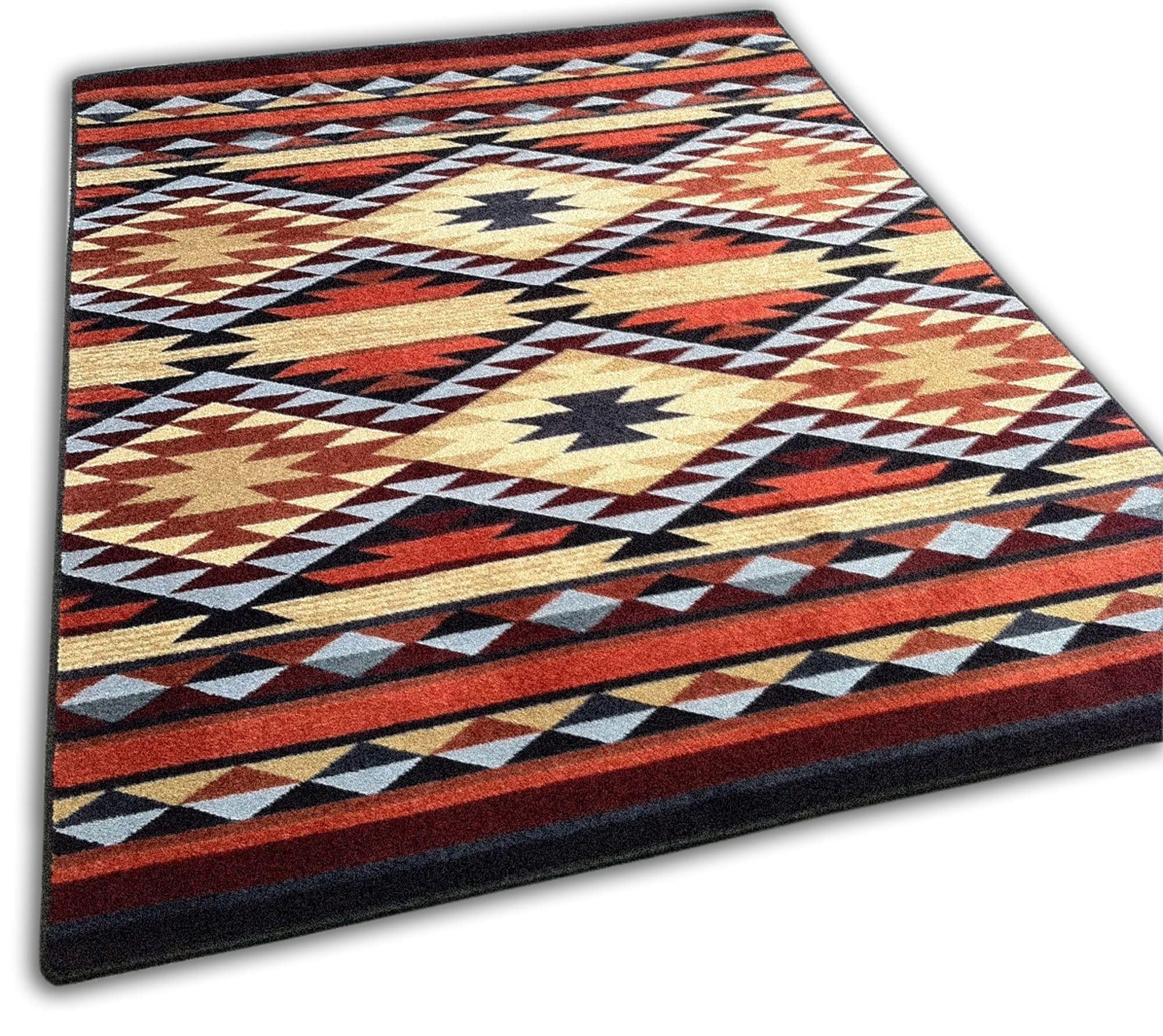 The Sancy Rio Southwestern Area Rugs collection showcases a stunning blend of earthy tones such as rust, burnt red, black, deep blue, tan, burnt orange, and lilac. These colors are intricately arranged in triangular patterns, forming magnificent diamond designs. Select from various sizes to enhance the beauty of your hallways, living spaces, bathroom, dining room, or any desired location with luxurious southwestern-inspired floor coverings.